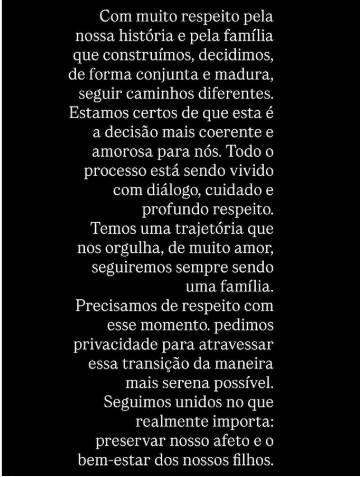 “Com muito respeito pela nossa história e pela família que construímos, decidimos, de forma conjunta e madura, seguir caminhos diferentes”, diz a publicação. “Estamos certos de que esta é a decisão mais coerente e amorosa para nós”.