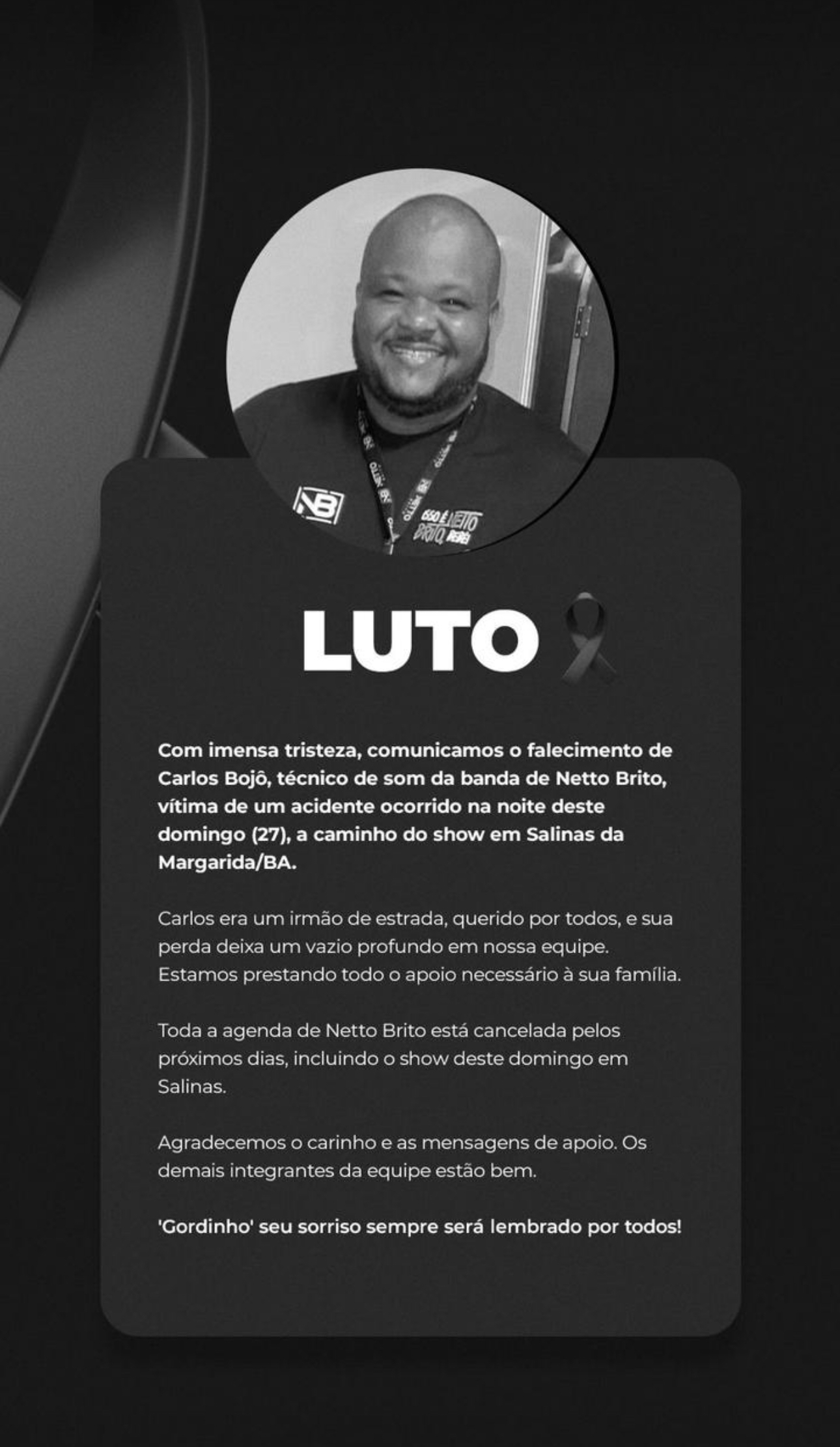 “Carlos era um irmão de estrada, querido por todos, e sua perda deixa um vazio enorme para a banda. Estamos prestando todo o apoio necessário à família”, diz o comunicado.